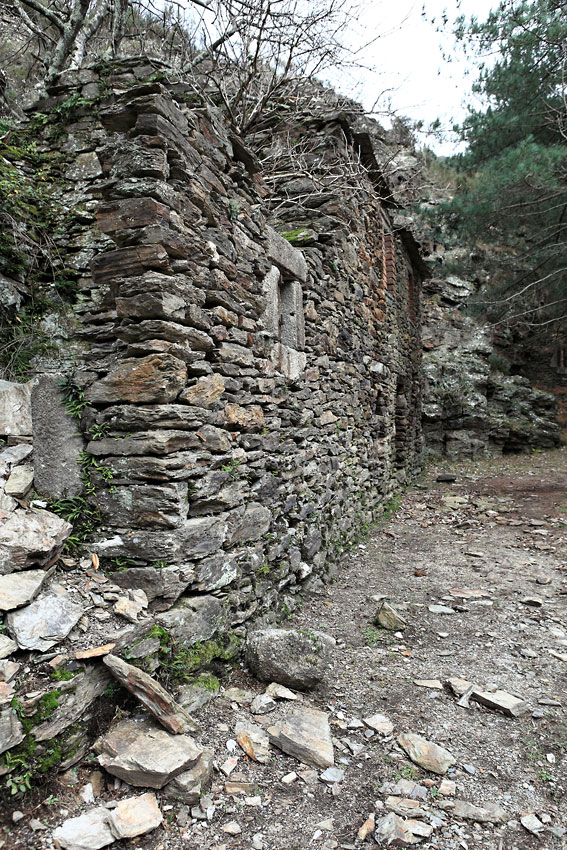 Bâtiments en ruine en bordure du chemin menant à la mine