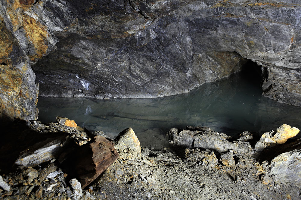 Plus loin, une galerie perpendiculaire croise le travers-banc principal ; malheureusement tout est noyé
