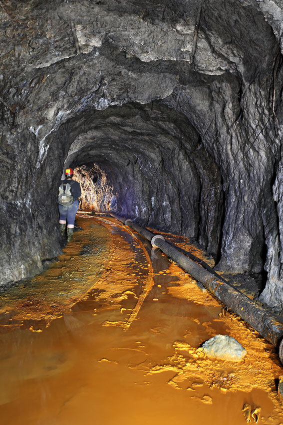 Le sol de cette galerie de roulage est fortement coloré par des oxydes de fer
