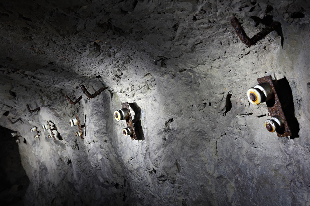 Dans une petite galerie, supports en porcelaine d'une ligne électrique