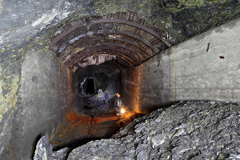 Dans le roulage principal, passage consolidé par un mur en béton et des cintres métalliques - Quartier B