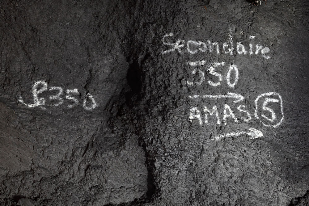 Indications peintes sur la paroi d'une galerie, P350 correspond au panneau 350 (zone d'exploitation) - Quartier B