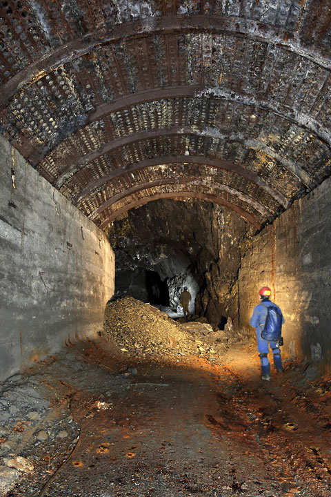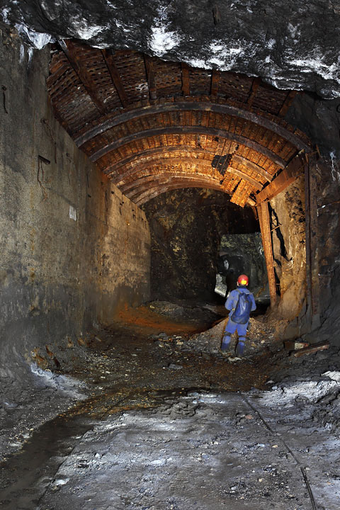 Dans le roulage principal, passages consolidés par des murs en béton et des cintres métalliques - Quartier B