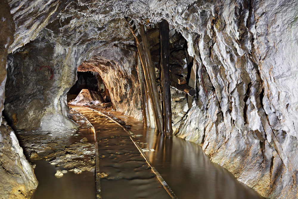 Cette ancienne galerie de roulage est encore équipée de sa voie ferrée étroite