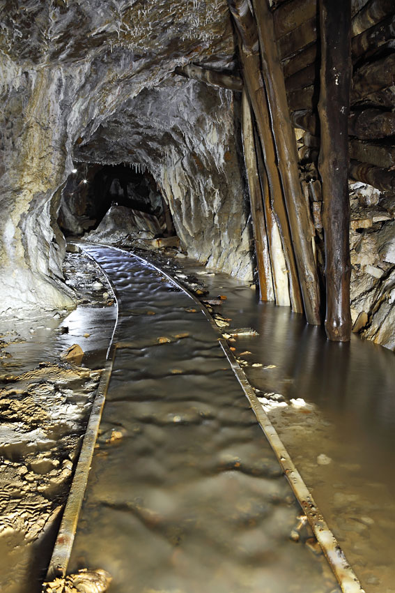 Cette ancienne galerie de roulage est encore équipée de sa voie ferrée étroite