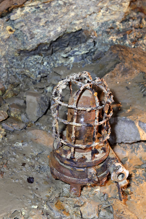 Une lampe turbinaire (elle fonctionnait à l'air comprimé) gisant au sol d'une galerie