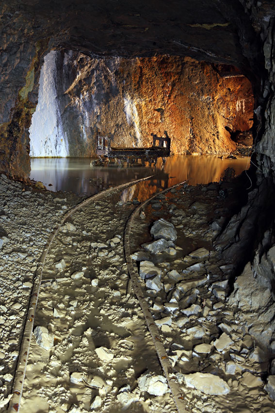 Vue sur un châssis de berline dans le roulage principal depuis une galerie secondaire