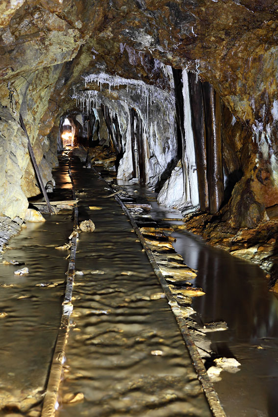 La galerie de roulage principale équipée d'une voie ferrée étroite