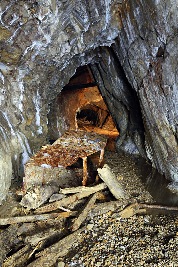 Le déversoir en métal d'une trémie abandonné dans une petite galerie