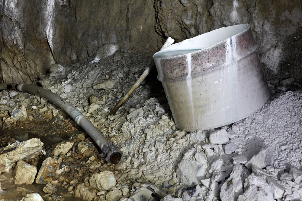 Vieux bidon métallique concrétionné au bout du roulage principal