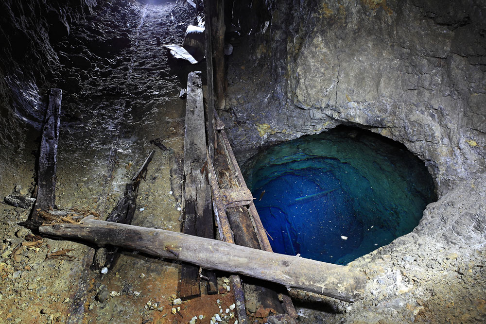 En bordure d'une voie de roulage, un puits noyé menant à des niveaux inférieurs ; les minéraux dissouts colorent l'eau d'un joli bleu