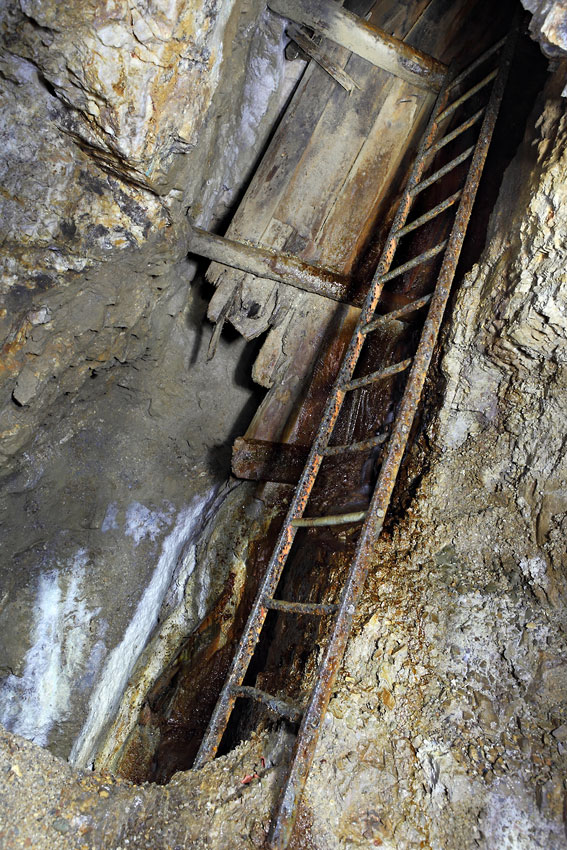 Au fond d'un secteur moderne de la mine, une échelle permettant d'accéder à des anciens travaux
