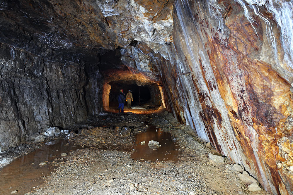 Une grande galerie de roulage 'trackless' dans un secteur moderne, notez à droite le miroir de faille