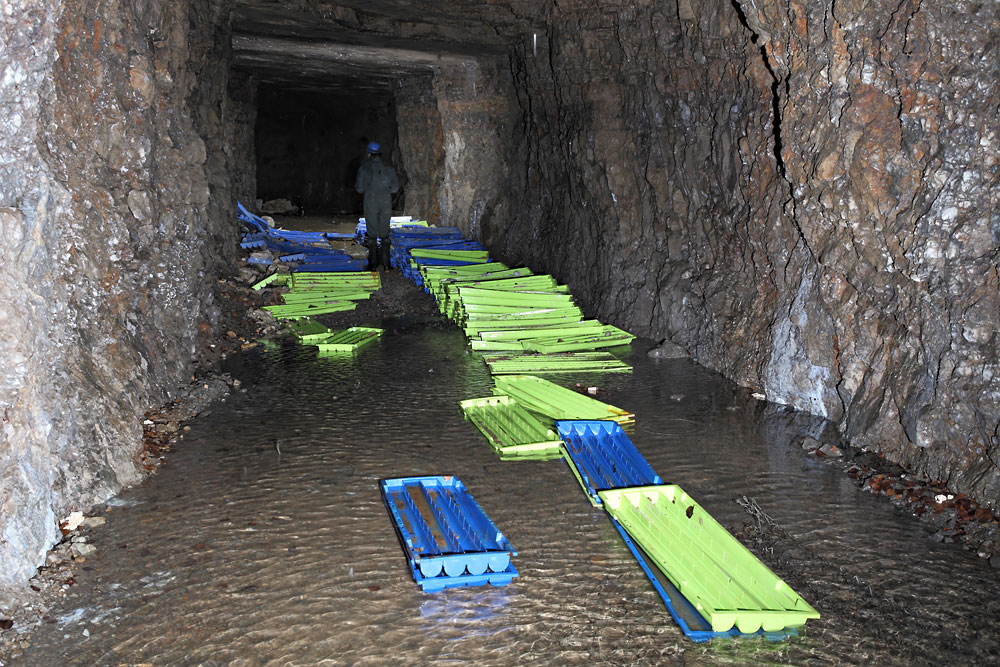 Bacs à carottes entreposés dans une petite galerie près de l'entrée
