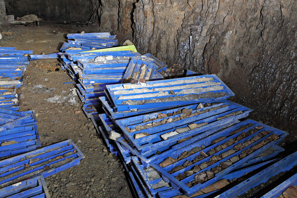 Bacs à carottes entreposés dans une petite galerie près de l'entrée