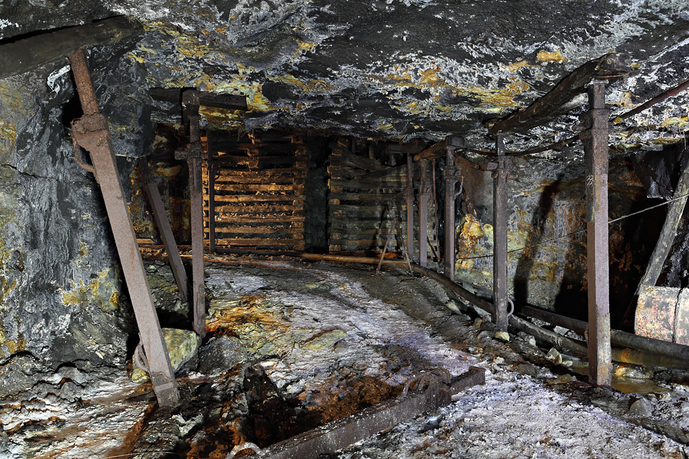Cette galerie est consolidée par des étançons métalliques et des empilements de traverses (au fond)