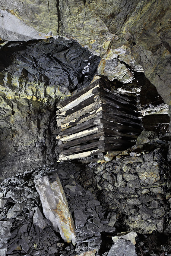 Une confortation composée d'un empilement de traverses en bois (nid d'abeille)