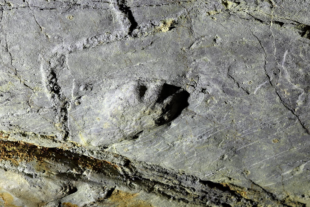 Au toit d'une galerie, une empreinte de pas de dinosaure fossilisée