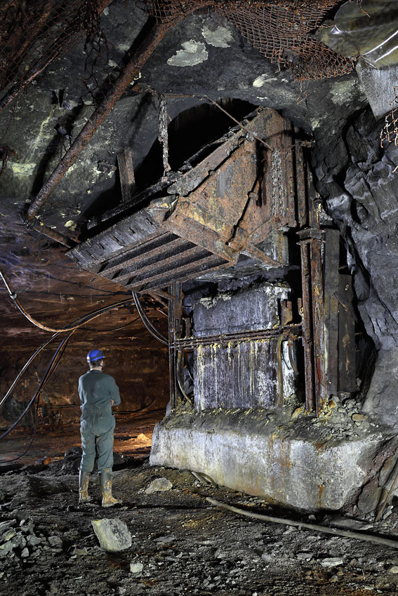 Une imposante trémie de chargement du minerai au bout du travers-banc principal