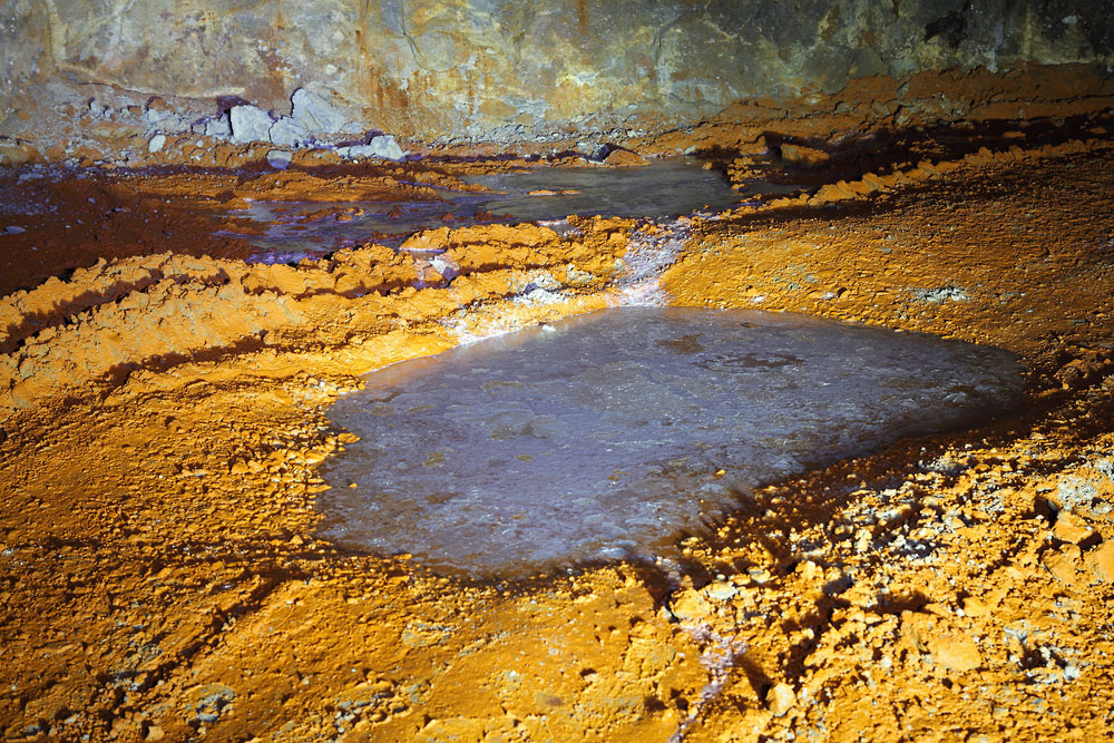 Le sol de ce quartier d'exploitation est fortement coloré par les oxydes métalliques