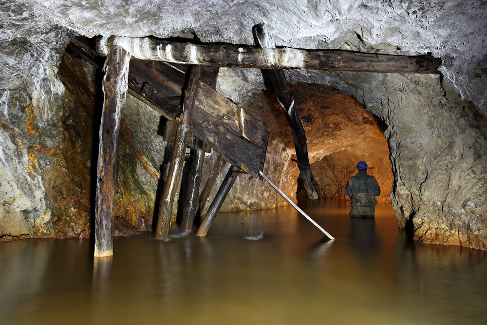 Superbe trémie de chargement en bois dans le roulage principal, fortement inondé