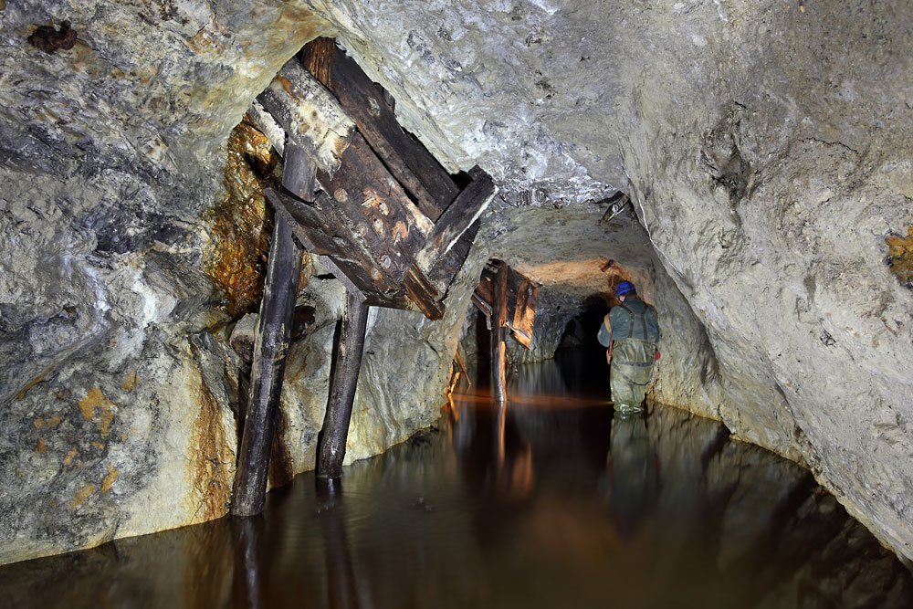 Trémies de chargement en bois dans le roulage principal, en progressant le niveau d'eau baisse