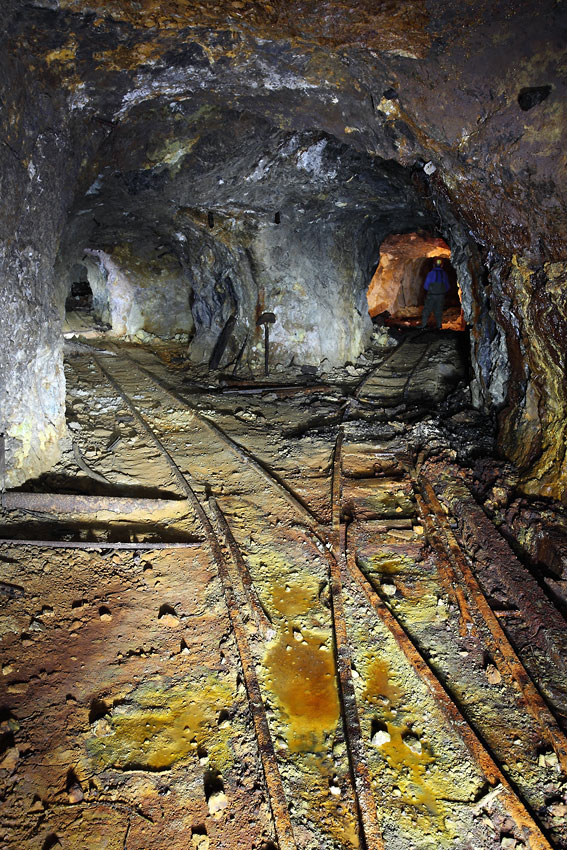 Bifurcation dans une galerie de roulage encore équipée de ses rails ; le secteur est fortement minéralisé