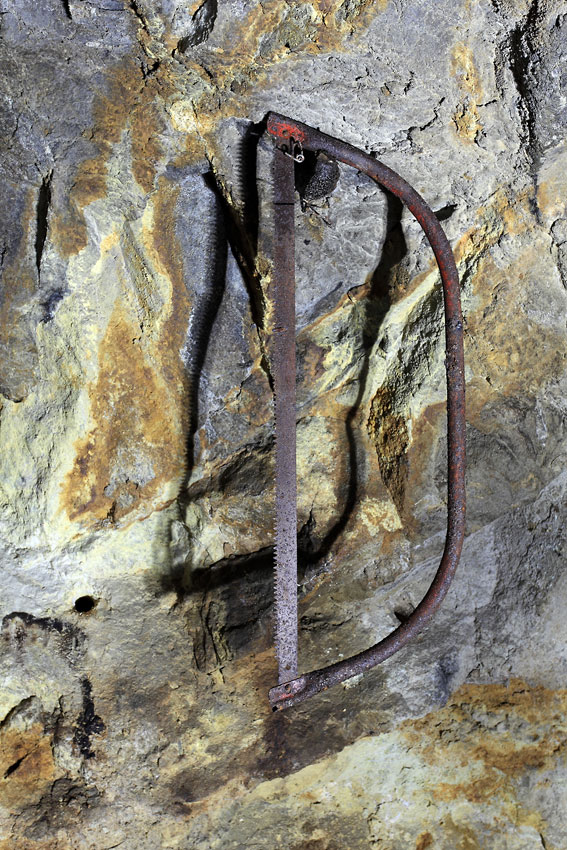 Une scie américaine suspendue sur la paroi d'une galerie de roulage