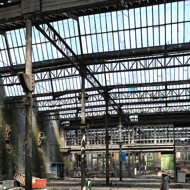 23/05/2010 | L'intérieur d'un bâtiment des Ateliers Centraux des Mines de Bruay, avec toiture en sheds - Bruay