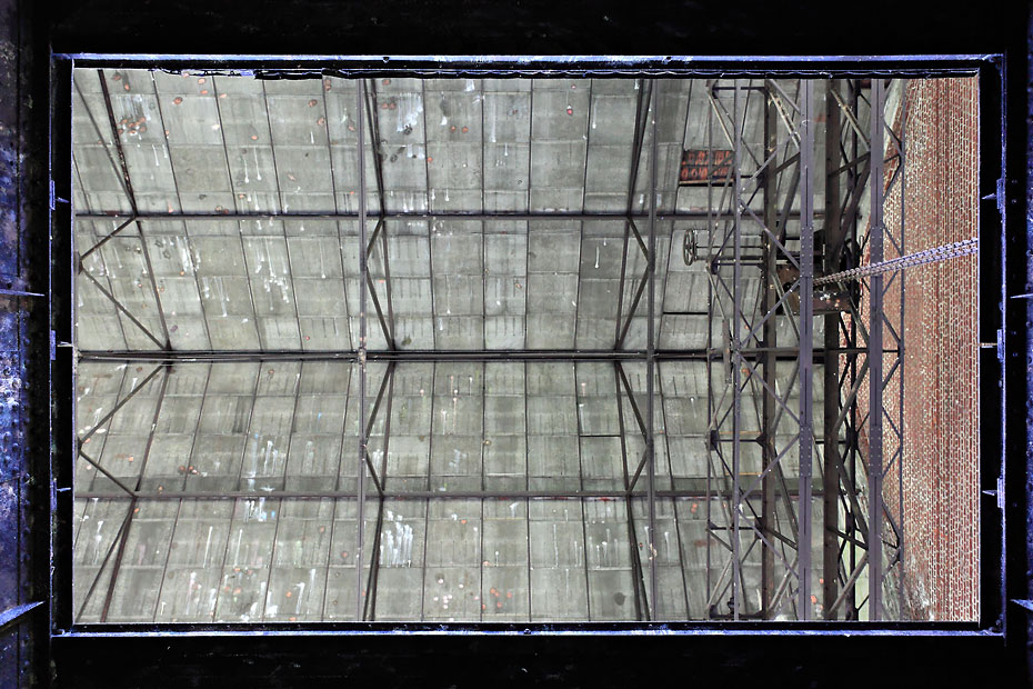 23/05/2010 | Vue depuis le sous-sol sur le pont roulant du bâtiment de la machine d'extraction du puits n°1bis des Mines de la Clarence - Divion