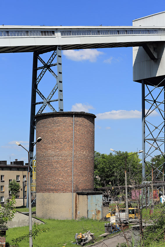 07/06/2016 | Petite tour maçonnée du puits IV surplombée par le grand convoyeur provenant du puits V (transport du charbon brut)