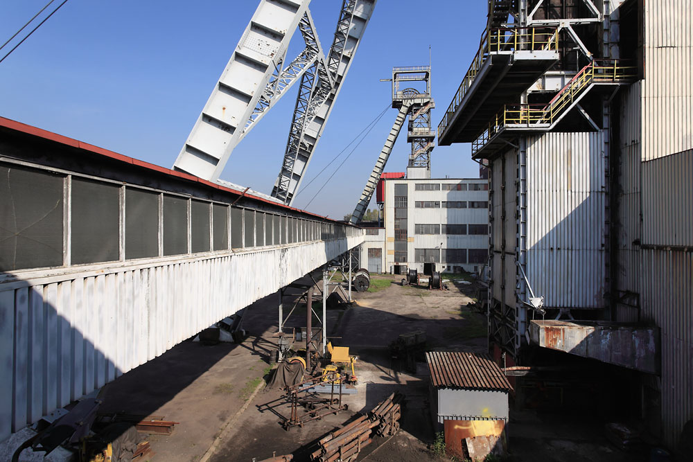 06/10/2014 | Au premier plan, recette à skips du puits Bolesław et passerelle couverte pour les mineurs vers la recette du puits Józef