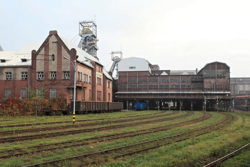 12/10/2014 | Chevalements des puits Bolesław et Józef, et un bâtiment du lavoir vus depuis le faisceau de voies ferrées de la mine