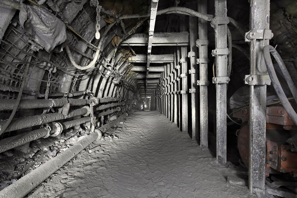 06/10/2014 | Travers-banc étayé : à gauche circulation des mineurs et des monorails, à droite le convoyeur à bande