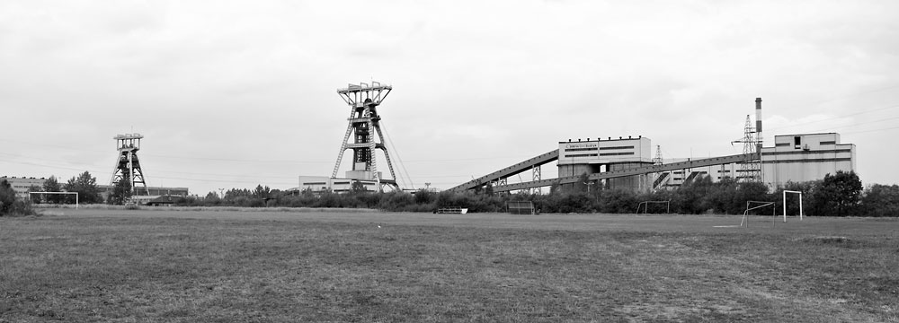 28/08/2013 | Vue panoramique sur le siège principal : chevalement du puits III, chevalement du puits I et lavoir avec ses silos de stockage