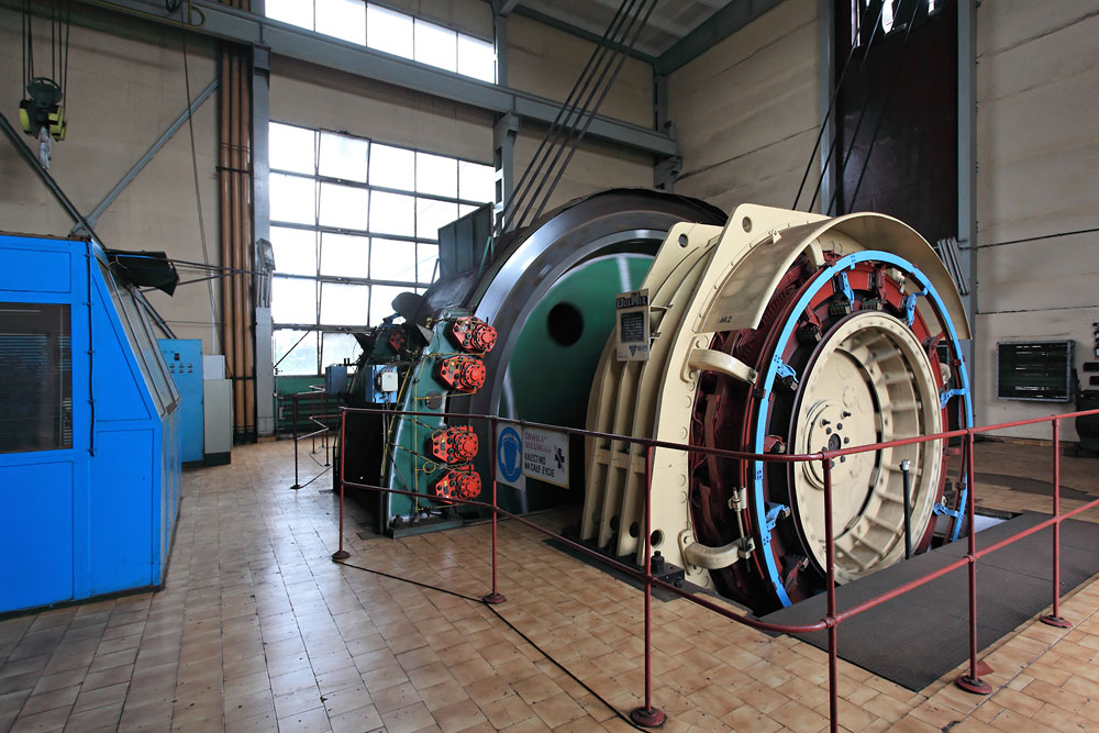 28/08/2013 | Machine d'extraction (poulie Koepe quadricâble) du puits I ; on aperçoit à gauche la cabine du machiniste