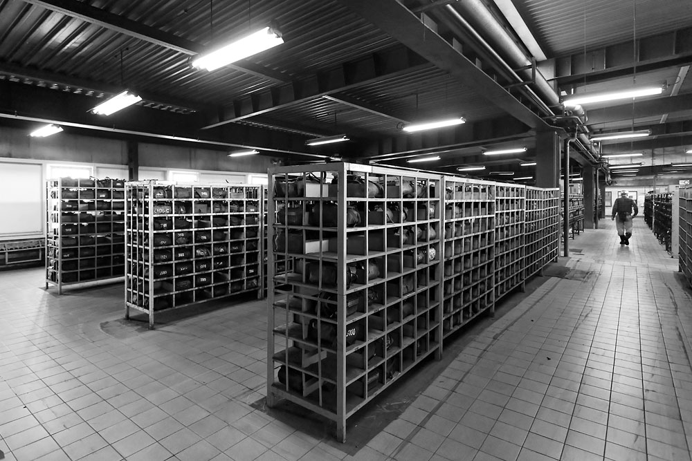 28/08/2013 | Dans la lampisterie, étagères de rangement des appareils autosauveteur, dont le port est obligatoire au fond