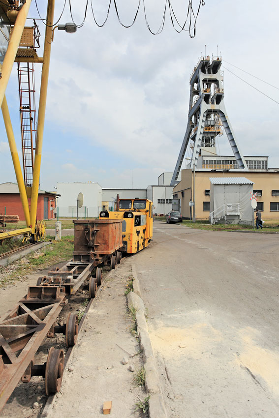 28/08/2013 | Loco diesel et berlines sur le carreau du puit VI (transport de matériel) ; au fond le chevalement du puits VI