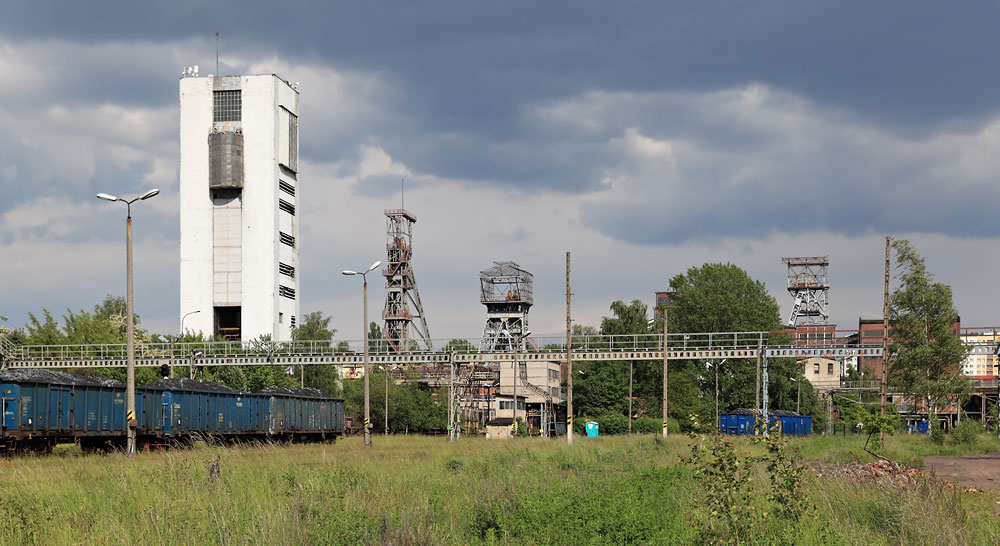 29/05/2013 | Train de charbon en attente sur les voies ferrées desservant la mine ; en arrière plan les 4 puits du siège principal