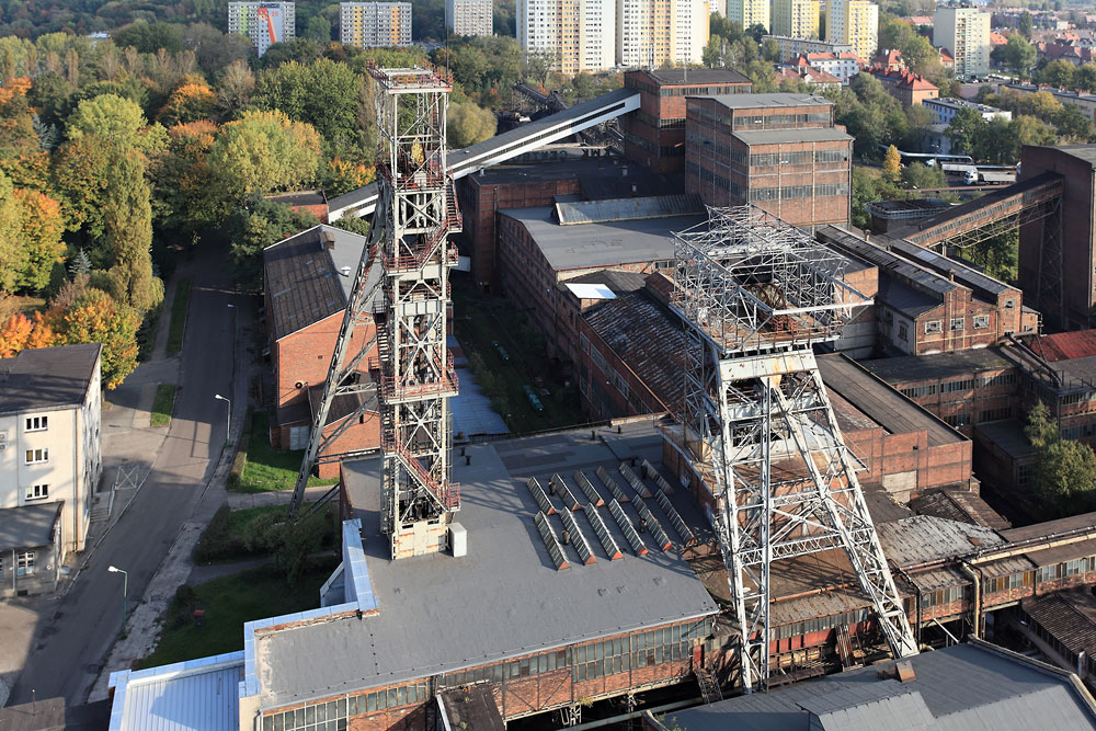 06/10/2014 | Vue sur les puits Skarga et Rejtan depuis la tour d'extraction du puits Budryk ; en arrière plan le lavoir