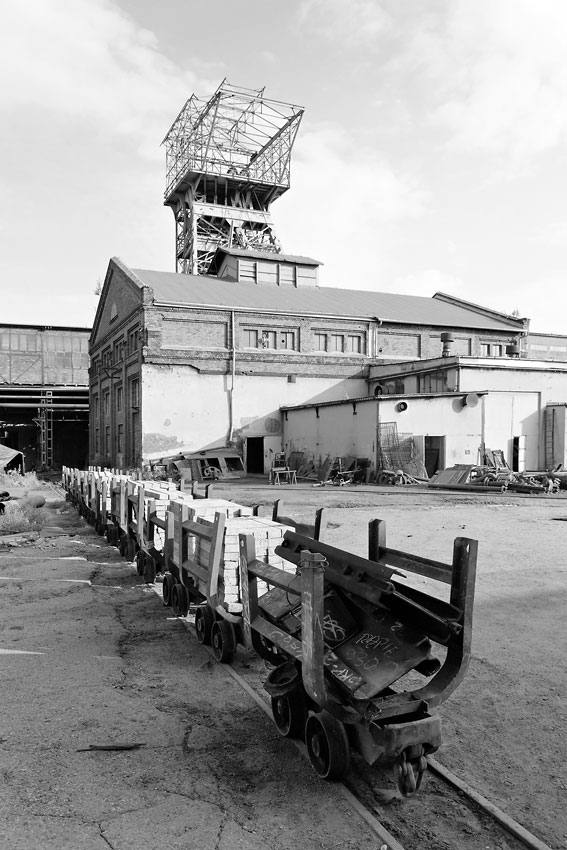 06/10/2014 | Berlines chargées de matériel destiné au fond devant le chevalement et le bâtiment de la machine d'extraction du puits Rejtan