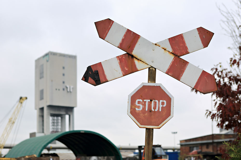 03/11/2017 | Passage à niveau vers le parc à matériel ; en arrière plan la tour d'extraction du puits VII