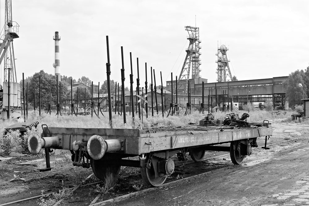 10/06/2015 | Wagon plat dans le parc à matériel ; au fond les chevalements des puits Kazimierz I et II