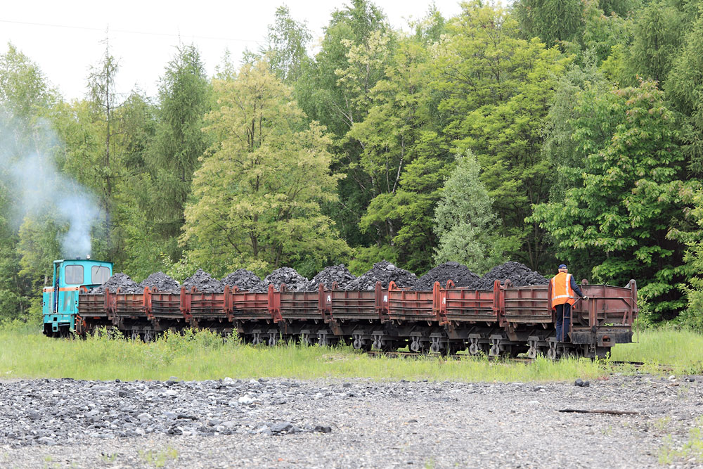 27/05/2013 | Train chargé de schistes du lavoir (stériles) sur la voie étroite de la mine, tiré par une loco diesel Wls150