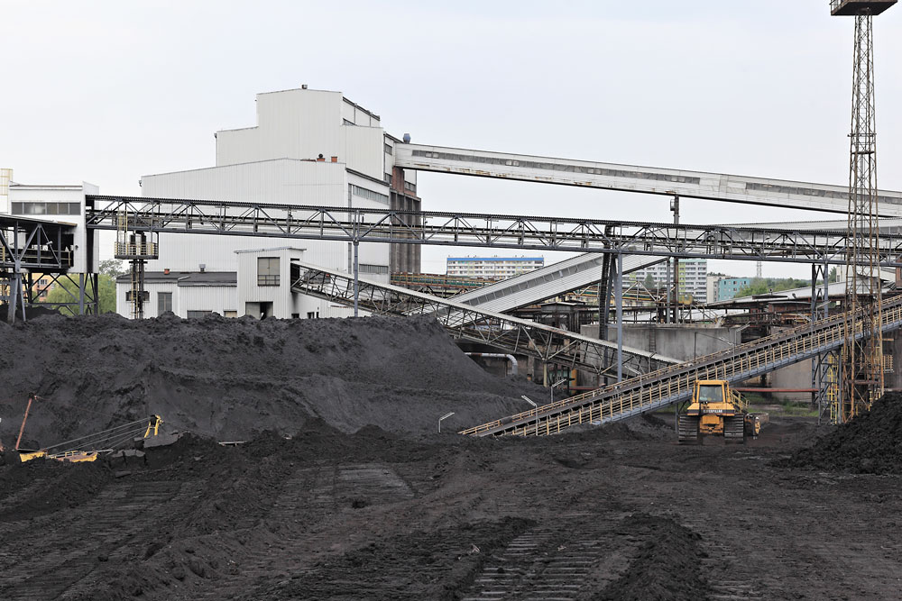 08/06/2015 | KWK Szczygłowice : tas de résidus issus du traitement du charbon ; le bâtiment au fond abrite les lignes de flottation du lavoir