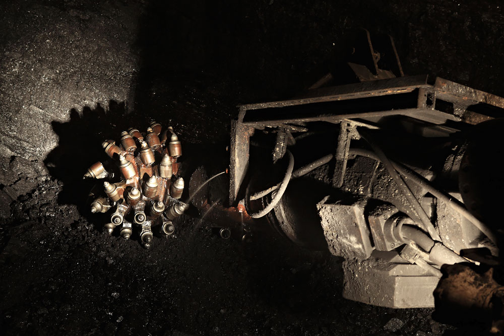 08/06/2015 | KWK Szczygłowice : chantier de traçage d'une galerie - détail sur la tête d'abattage du mineur continu garnie de pics