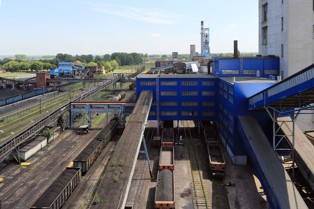 08/06/2016 | Siège Wschód : vue sur les voies ferrées, les installations du puits Jan et au fond le puits Paweł depuis le lavoir