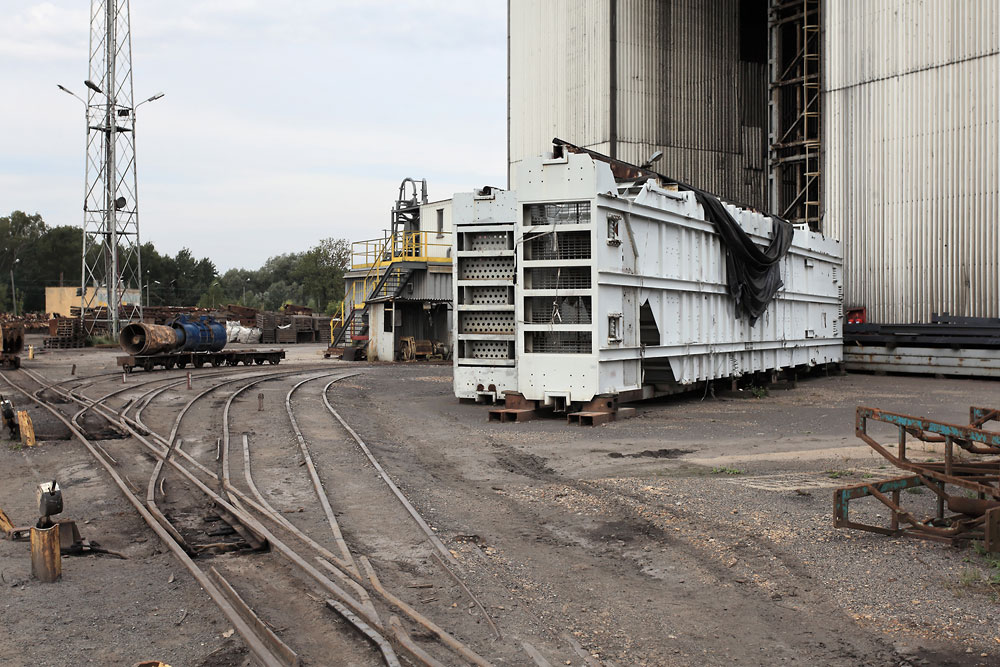 23/09/2015 | 2 skips stockés au pied de la tour d'extraction du puits IV ; les voies ferrées sur le carreau sont souvent à double écartement