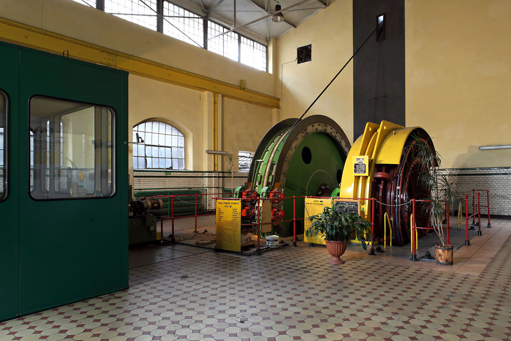 23/09/2015 | Machine d'extraction 'sud' du puits I : poulie Koepe entraînée par un moteur électrique ; à gauche la cabine du machiniste