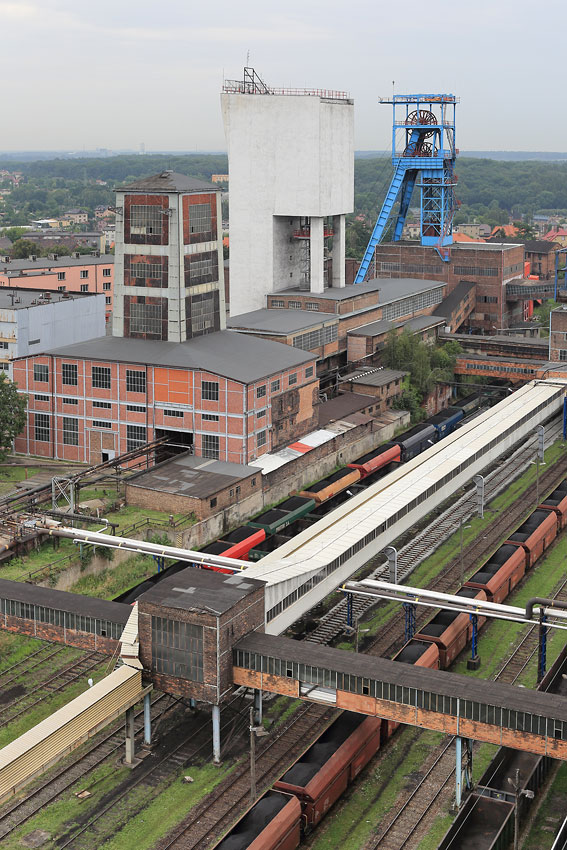 04/08/2017 | Tours d'extraction et recettes des puits Wiktor et Antoni, chevalement et recette du puits III (Julia), vus depuis le lavoir